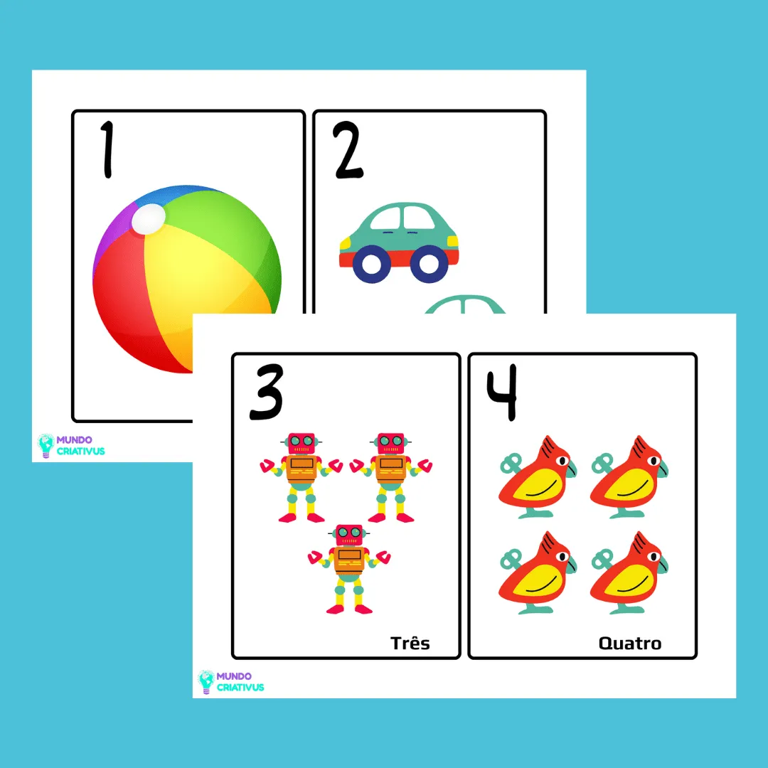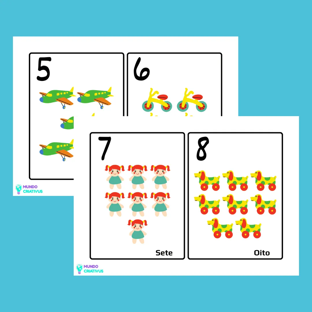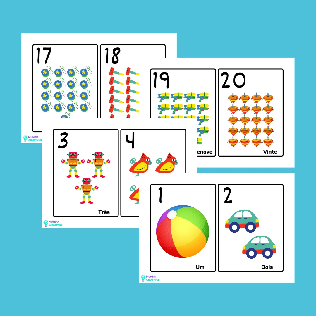 - O Numeral (O Símbolo): No topo de cada card, o algarismo se destaca em tamanho grande, garantindo o reconhecimento visual imediato. A criança se familiariza rapidamente com a forma gráfica de cada número, de 1 a 20.